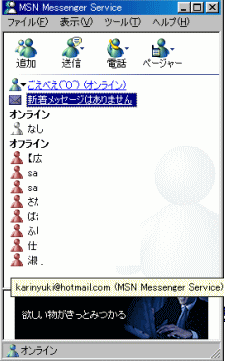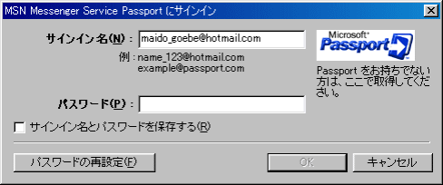 | メッセンジャーをちゃんとインストールでき、Passportを取得したら(Hotmailのアカウントを持っていれば、もうすでにPassportはある)メッセンジャーでサインインしてみましょう。 「サインイン名」のところにPassportを取得したメールアドレス、またはHotmailのアカウントを入れて、そのときに作ったパスワードを入力すると、サインインできます。(下は私のアカウントです) 注意:パスワードは覚えて、その場、その場でいれるようにしましょう。パソコンを誰かと共有している場合、勝手ネットにつながった途端にサインインされ、トラブルのもとになります。 |