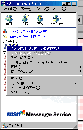 | メンバーができたら、オンラインになっている友人(緑色になっている人)のところで右クリックをすると「インスタントメッセージの送信」という項目が出ますので、それをクリックします。 | |