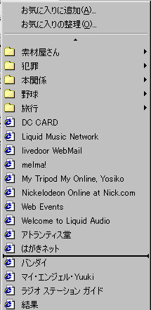 また、上の図では、「アルファベット順」「五十音順」に並んでいますが、普通に「お気に入り」をクリックしたときは、作った順にでてきますので、自分がよく使うものは、ドラッグして上の位置に移動させることもできます。(移動は「整理」ではないときに行います)