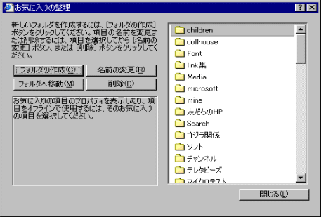 まず、同じようにメニューまたはツールバーの「お気に入り」をクリックします。そして「整理」または「お気に入りに整理」をクリックします。すると下のようなダイアログボックスがでてきます。整理したいものを選んで、あらかじめあるフォルダに入れたり、新規フォルダを作成してそこへ入れたり、自分の使いやすいように整理します。