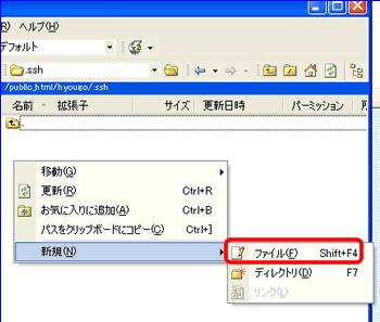 「.ssh」フォルダを開いた、リモート側(右側)で右クリックします。