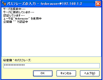 このとき、下図のようにパスフレーズの入力が出てきて、パスフレーズを入れると接続されたら、成功です。 |